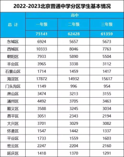 此外,根据目前北京市在校生人数来看,今年参加高考的高三学生共有61359名学生在读。而新高三,即现高二在校生,则在现高三的基础上增加1000多人。而现高一,即9月份的新高二学生,在校人数直接突破了75000人,相比今年的高考生再次增加10000人。
