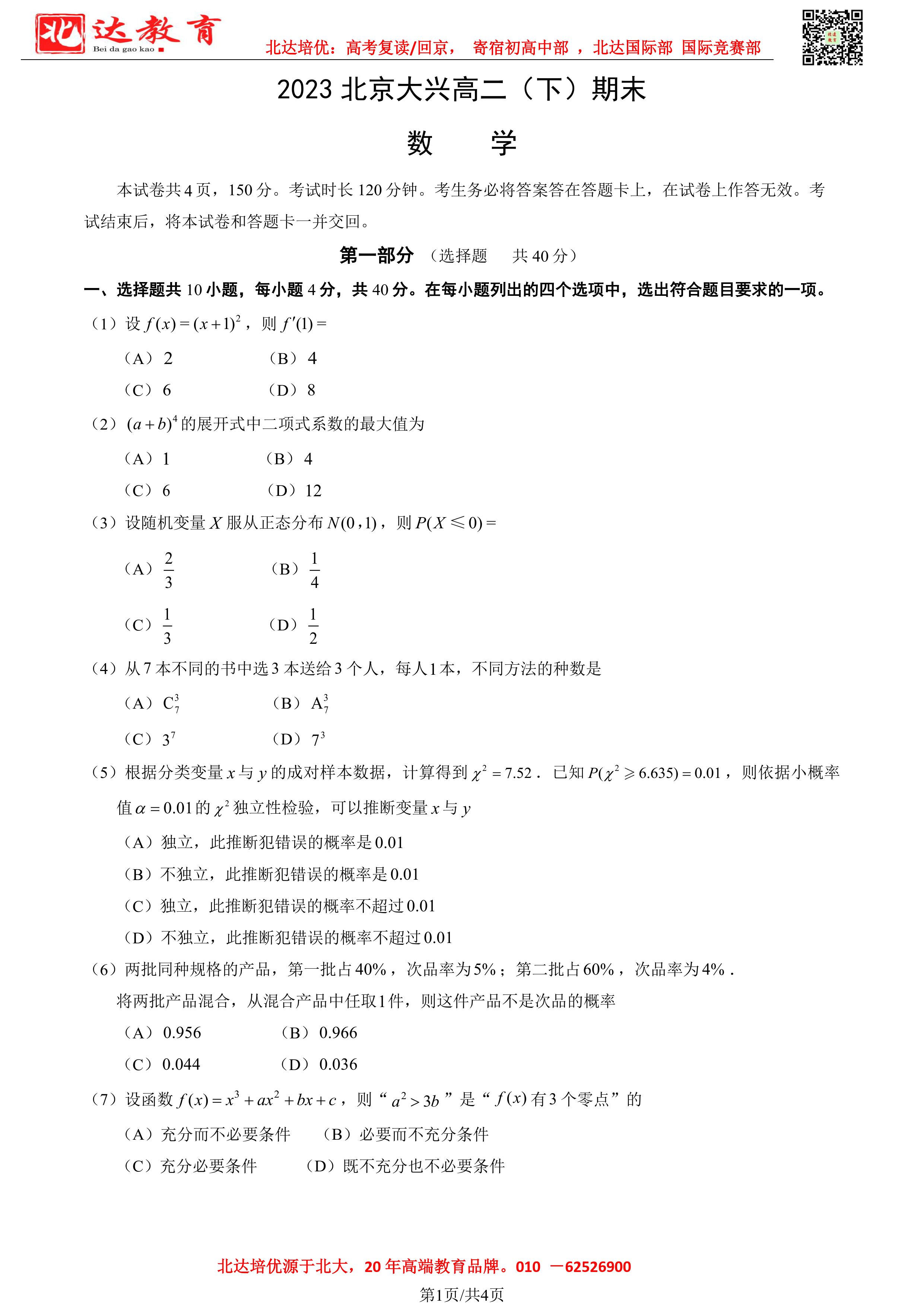北京市2022-2023年高二下学期期末考试7月5日开考,为了帮助考生更好的核对考试答案,admw360复读学校整理了2022-2023学年北京大兴区高二下学期期末数学试题及答案,供考生参考。