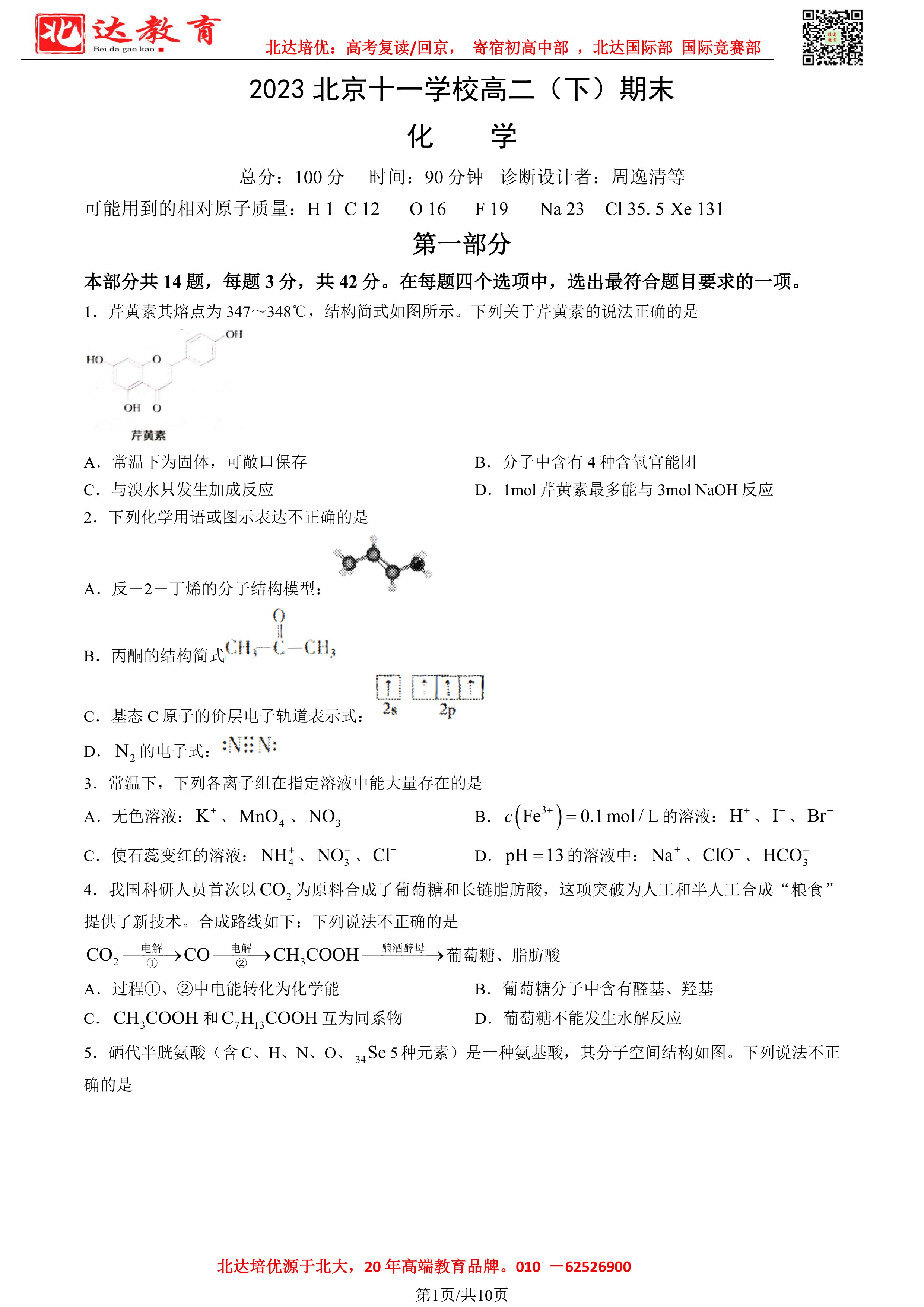 北京市2022-2023年高二下学期期末考试7月5日开考,为了帮助考生更好的核对考试答案,admw360复读学校整理了2022-2023学年北京十一学校高二下学期期末化学试题及答案,供考生参考。