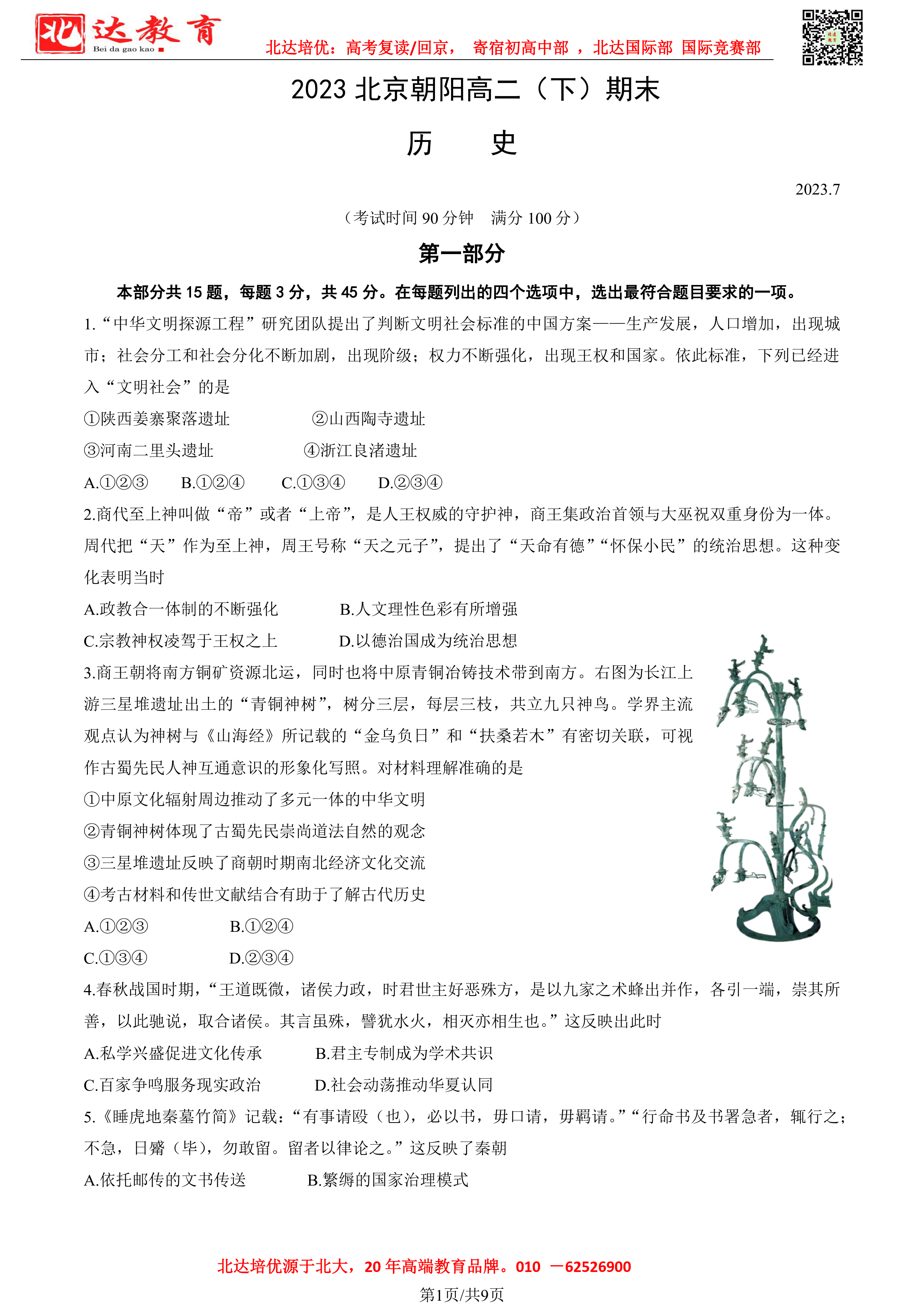 北京市2022-2023年高二下学期期末考试7月5日开考,为了帮助考生更好的核对考试答案,admw360复读学校整理了2022-2023学年北京朝阳区高二下学期期末历史试题及答案,供考生参考。