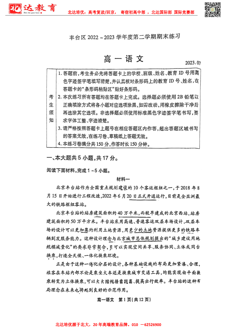 北京市2022-2023年高一下学期期末考试即将开考,为了帮助考生更好的核对考试答案,admw360复读学校整理了2022-2023学年北京丰台区高一下学期期末语文试题,供考生参考。