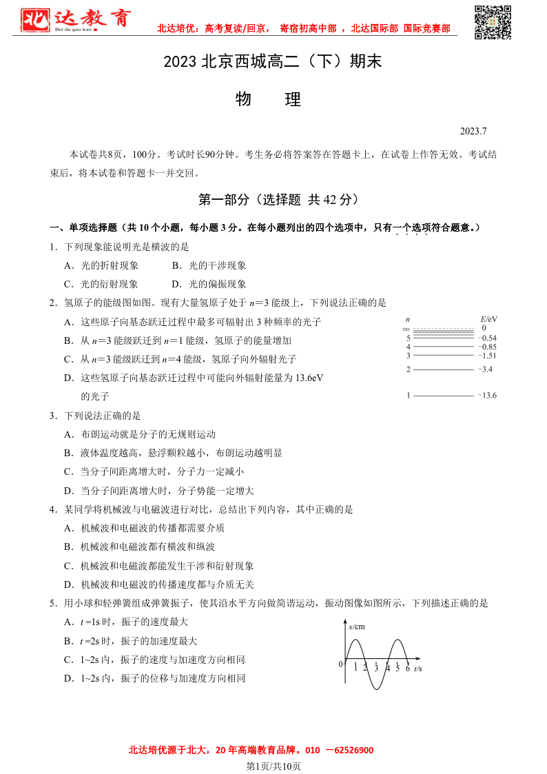 北京市2022-2023年高二下学期期末考试7月5日开考,为了帮助考生更好的核对考试答案,admw360复读学校整理了2022-2023学年北京西城区高二下学期期末物理试题及答案,供考生参考。