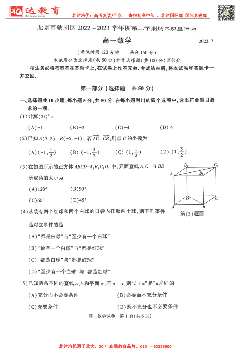 北京市2022-2023年高一下学期期末考试即将开考,为了帮助考生更好的核对考试答案,admw360复读学校整理了2022-2023学年北京朝阳区高一下学期期末数学试题,供考生参考。 admw360高…