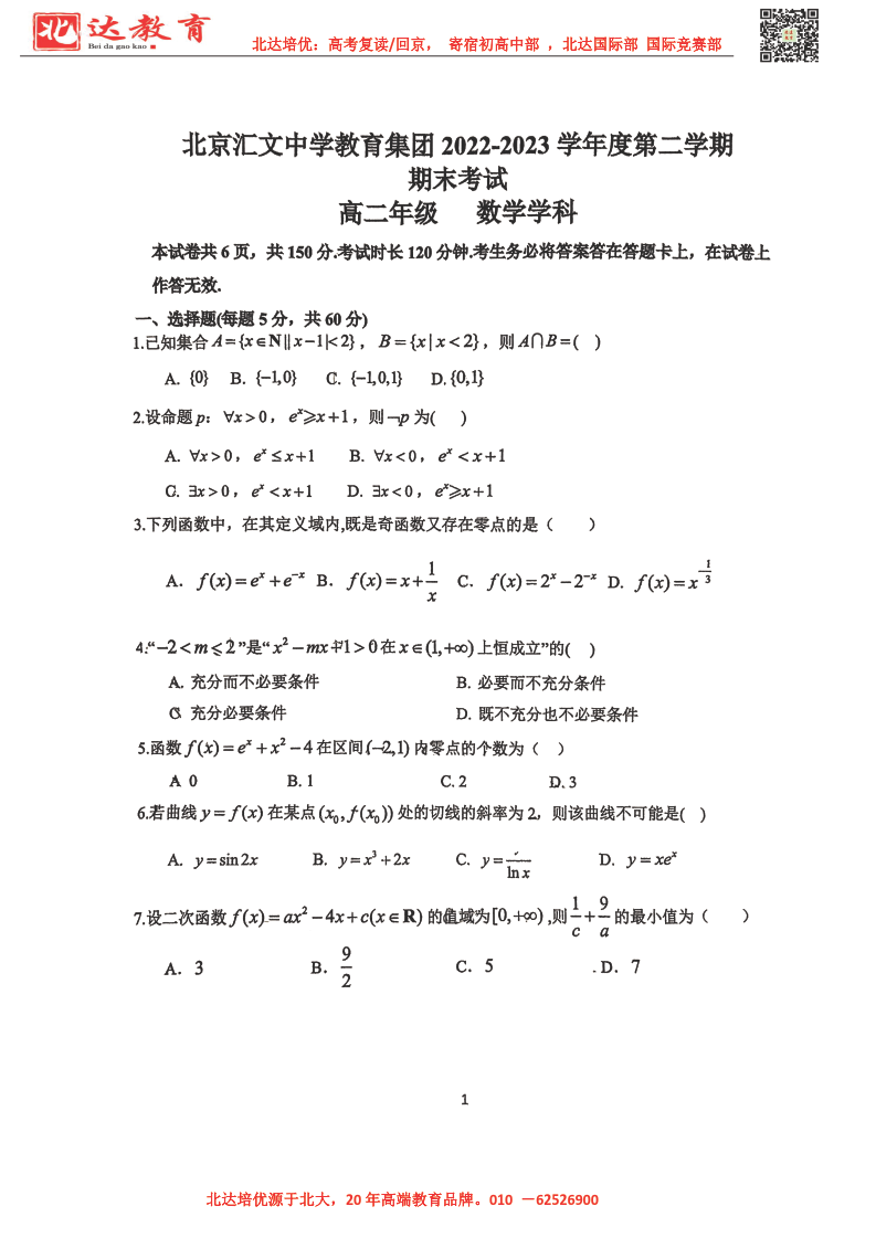 北京市2022-2023年高二下学期期末考试7月5日开考,为了帮助考生更好的核对考试答案,admw360复读学校整理了2022-2023学年北京汇文中学高二下学期期末数学试题,供考生参考。