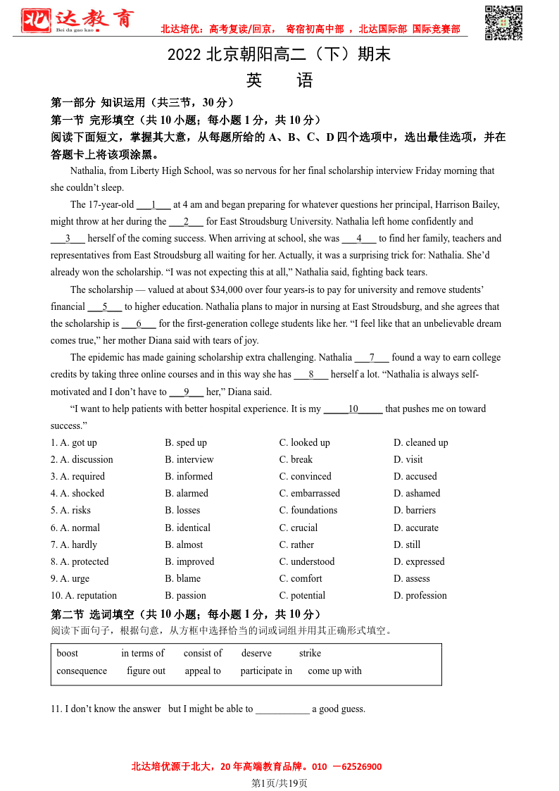 北京市2022-2023年高二下学期期末考试即将开考,为了帮助考生更好的核对考试答案,admw360复读学校整理了2021-2022学年北京朝阳区高二下学期期末英语试题及答案,供考生参考。