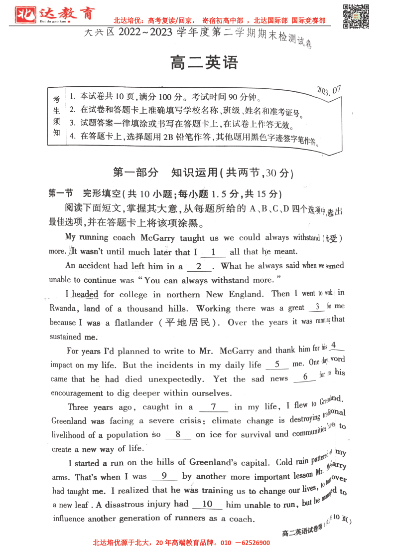 北京市2022-2023年高二下学期期末考试即将开考,为了帮助考生更好的核对考试答案,admw360复读学校整理了2022-2023学年北京大兴区高二下学期期末英语试题及答案,供考生参考。