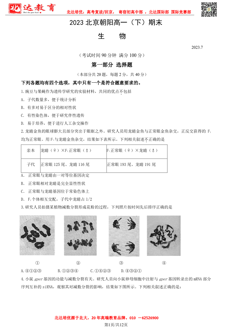 北京市2022-2023年高一下学期期末考试即将开考,为了帮助考生更好的核对考试答案,admw360复读学校整理了2022-2023学年北京朝阳区高一下学期期末生物试题及答案,供考生参考。