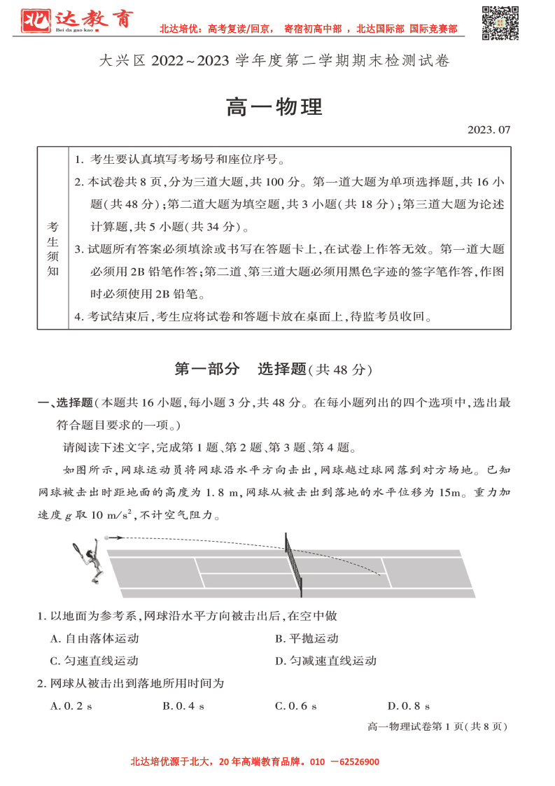 北京市2022-2023年高一下学期期末考试即将开考,为了帮助考生更好的核对考试答案,admw360复读学校整理了2022-2023学年北京大兴区高一下学期期末物理试题,供考生参考。