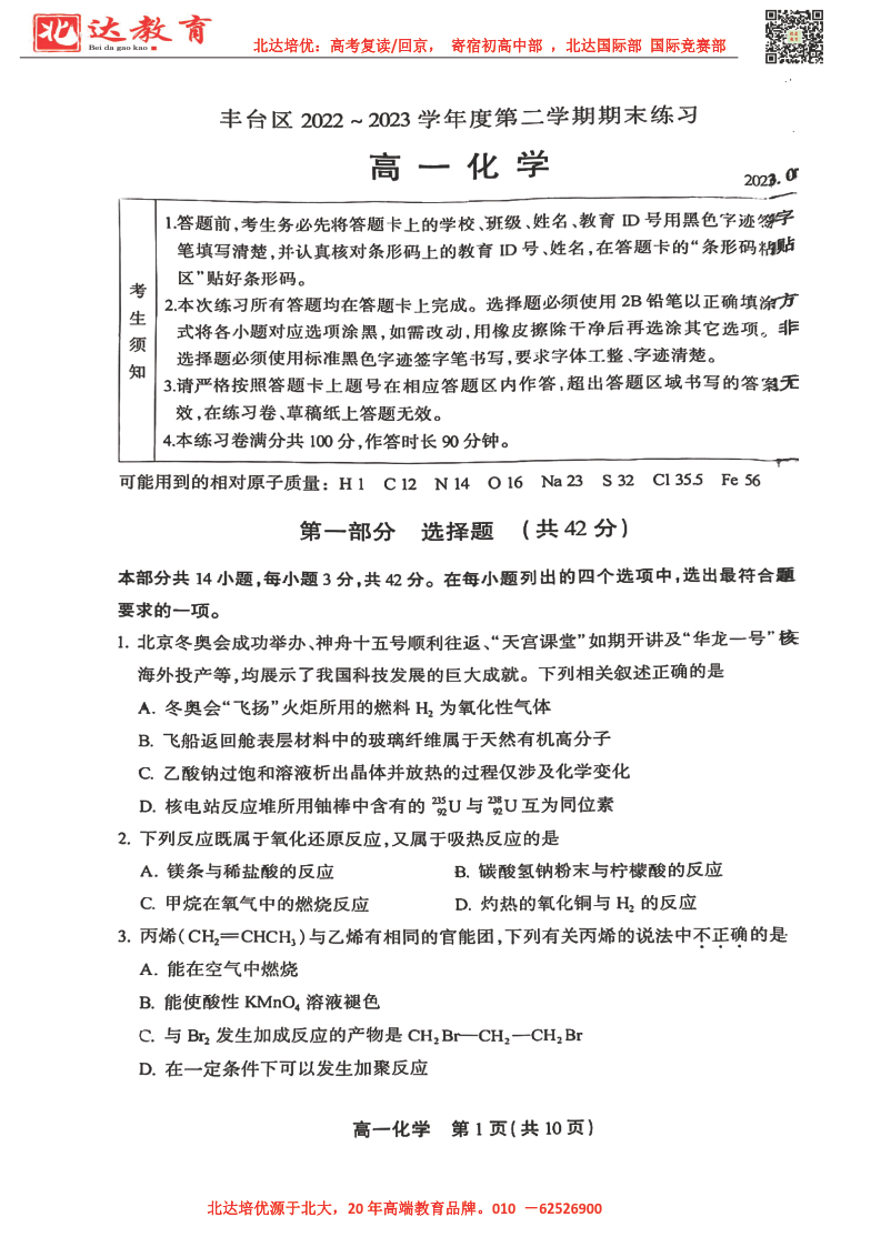 北京市2022-2023年高一下学期期末考试即将开考,为了帮助考生更好的核对考试答案,admw360复读学校整理了2022-2023学年北京丰台区高一下学期期末化学试题及答案,供考生参考。