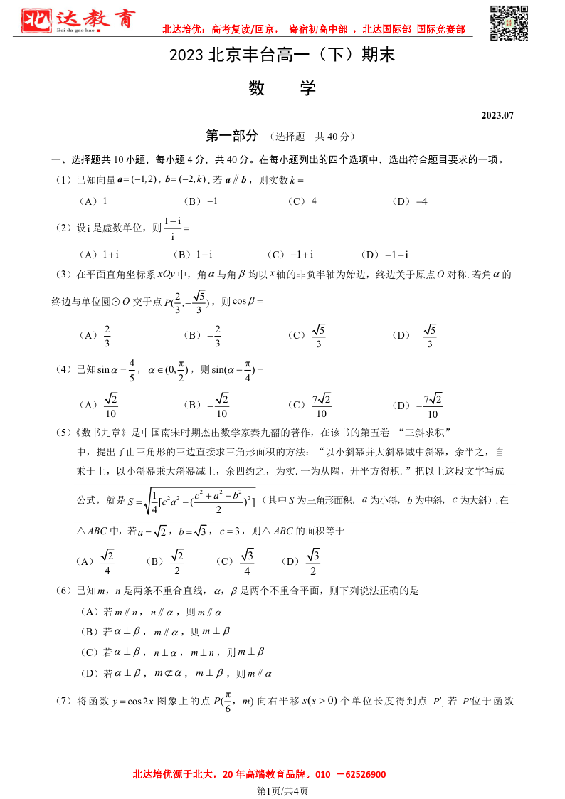 北京市2022-2023年高一下学期期末考试即将开考,为了帮助考生更好的核对考试答案,admw360复读学校整理了2022-2023学年北京丰台区高一下学期期末数学试题及答案,供考生参考。
