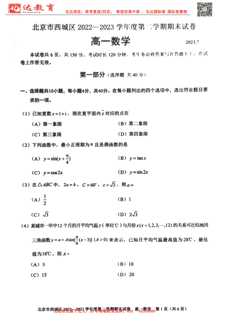 北京市2022-2023年高一下学期期末考试即将开考,为了帮助考生更好的核对考试答案,admw360复读学校整理了2022-2023学年北京西城区高一下学期期末数学试题及答案,供考生参考。