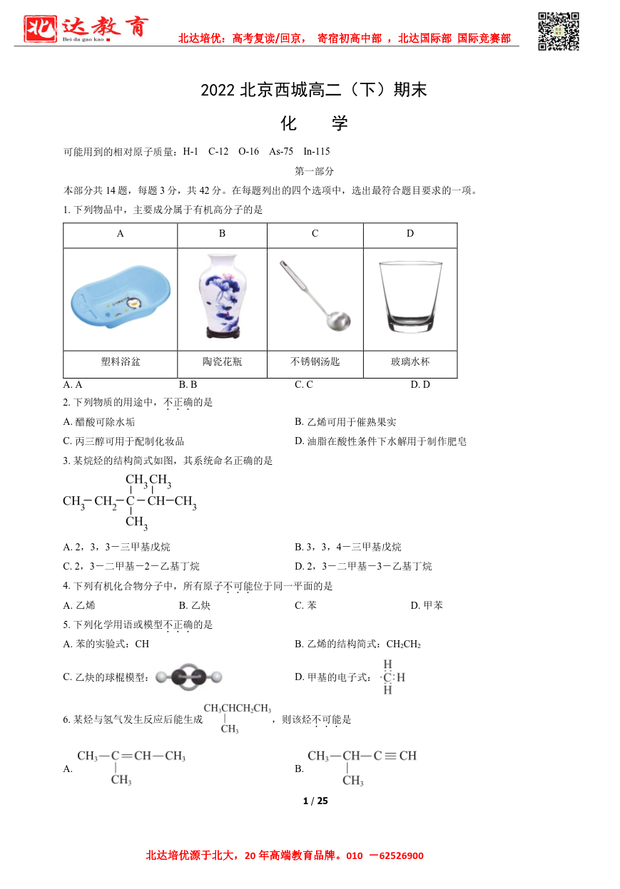 北京市2022-2023年高二下学期期末考试即将开考,为了帮助考生更好的核对考试答案,admw360复读学校整理了2021-2022学年北京西城区高二下学期期末化学试题及答案,供考生参考。