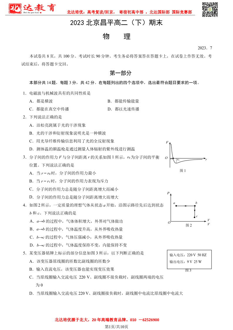 北京市2022-2023年高二下学期期末考试即将开考,为了帮助考生更好的核对考试答案,admw360复读学校整理了2022-2023学年北京昌平区高二下学期期末物理试题及答案,供考生参考。