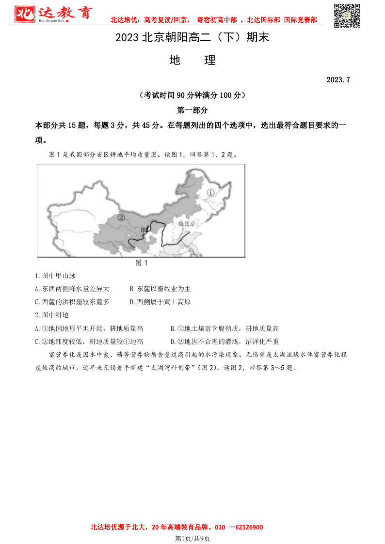 北京市2022-2023年高二下学期期末考试即将开考,为了帮助考生更好的核对考试答案,admw360复读学校整理了2022-2023学年北京朝阳区高二下学期期末地理试题及答案,供考生参考。
