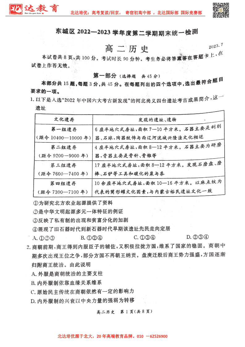 北京市2022-2023年高二下学期期末考试即将开考,为了帮助考生更好的核对考试答案,admw360复读学校整理了2022-2023学年北京东城区高二下学期期末历史试题及答案,供考生参考。