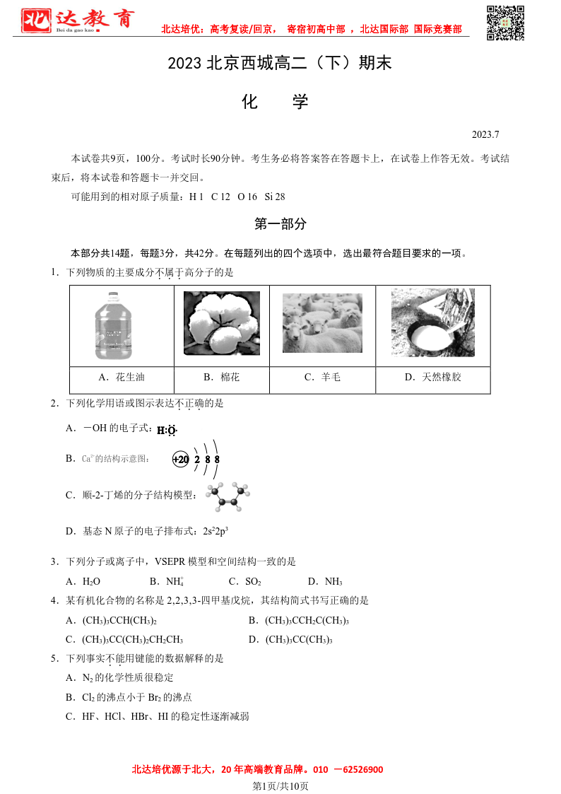 北京市2022-2023年高二下学期期末考试即将开考,为了帮助考生更好的核对考试答案,admw360复读学校整理了2022-2023学年北京西城区高二下学期期末化学试题及答案,供考生参考。