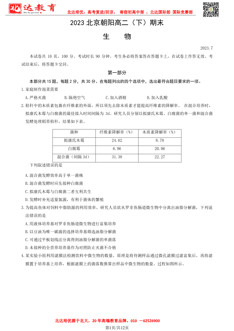 北京市2022-2023年高二下学期期末考试即将开考,为了帮助考生更好的核对考试答案,admw360复读学校整理了2022-2023学年北京朝阳区高二下学期期末生物试题及答案,供考生参考。