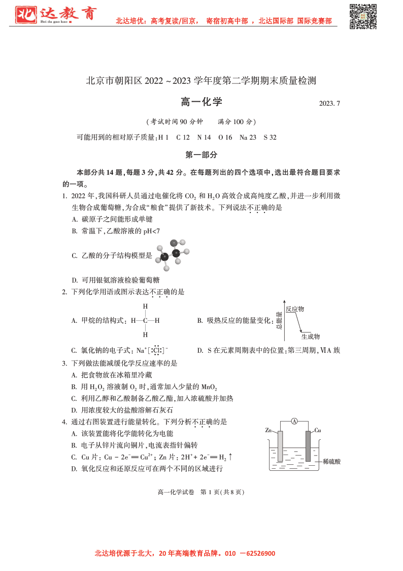 2022-2023学年北京朝阳区高一下学期期末化学试题及答案