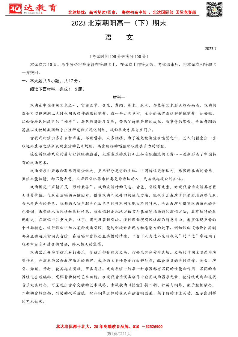 北京市2022-2023年高一下学期期末考试即将开考,为了帮助考生更好的核对考试答案,admw360复读学校整理了2022-2023学年北京朝阳区高一下学期期末语文试题及答案,供考生参考。