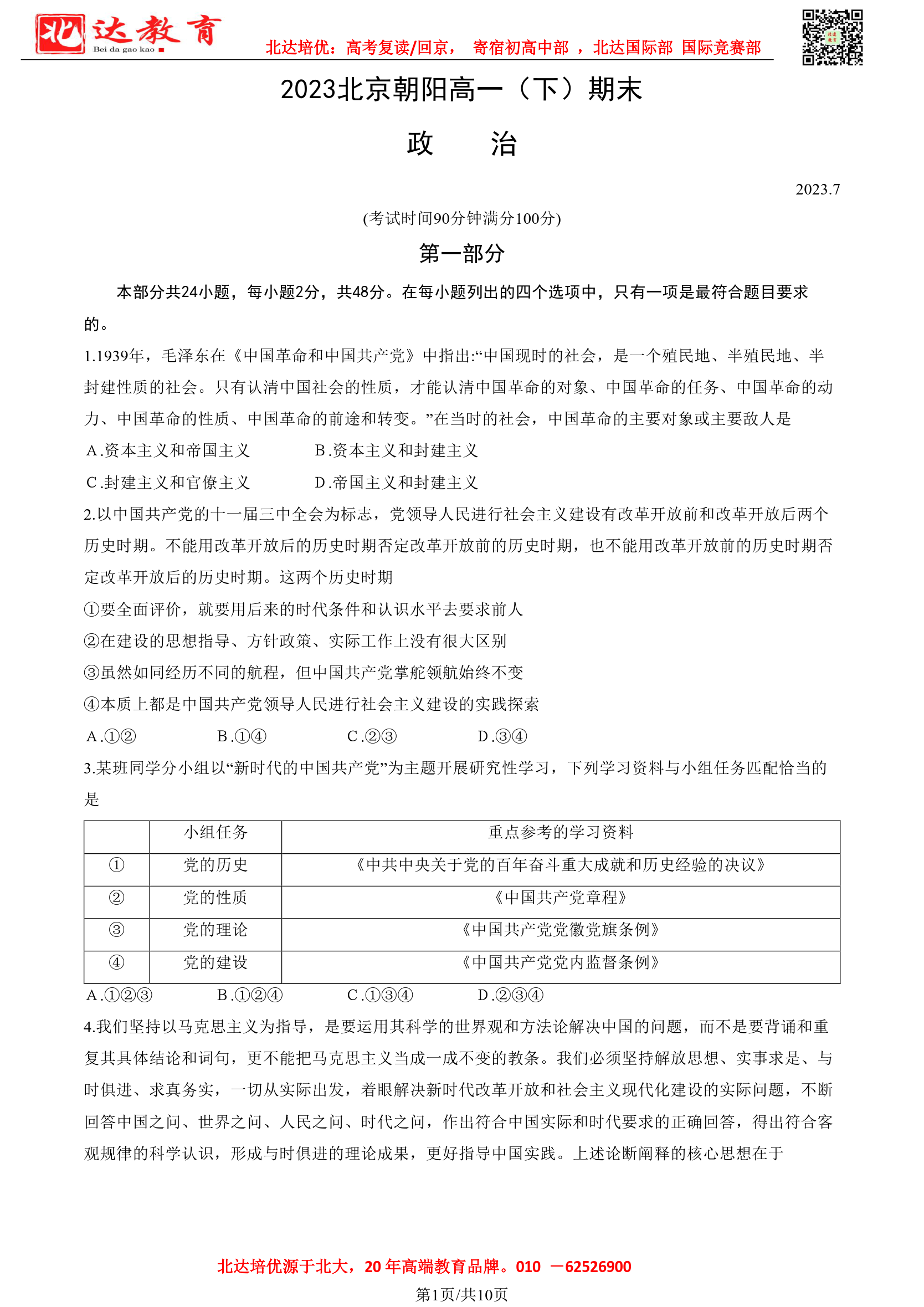 北京市2022-2023年高一下学期期末考试即将开考,为了帮助考生更好的核对考试答案,admw360复读学校整理了2022-2023学年北京朝阳区高一下学期期末政治试题及答案,供考生参考。