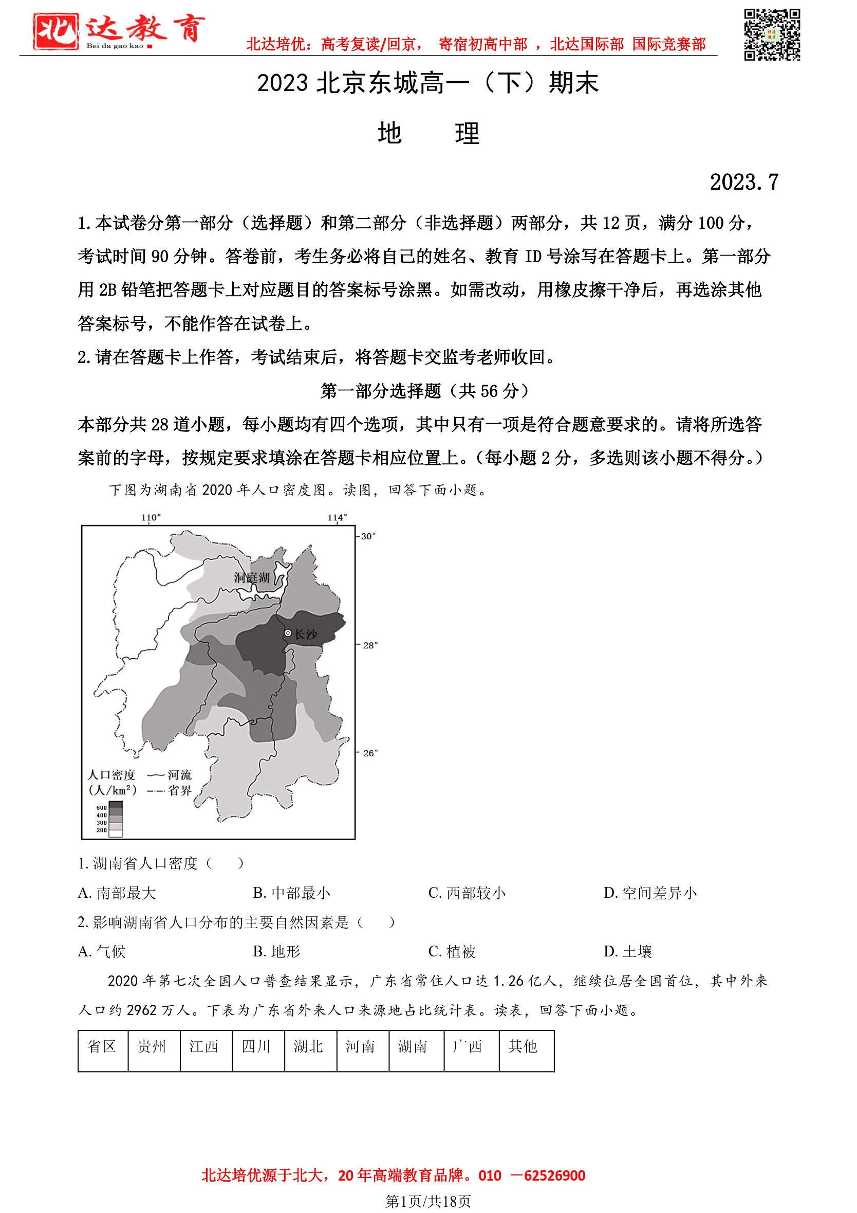 北京市2022-2023年高一下学期期末考试即将开考,为了帮助考生更好的核对考试答案,admw360复读学校整理了2022-2023学年北京东城区高一下学期期末地理试题及答案,供考生参考。