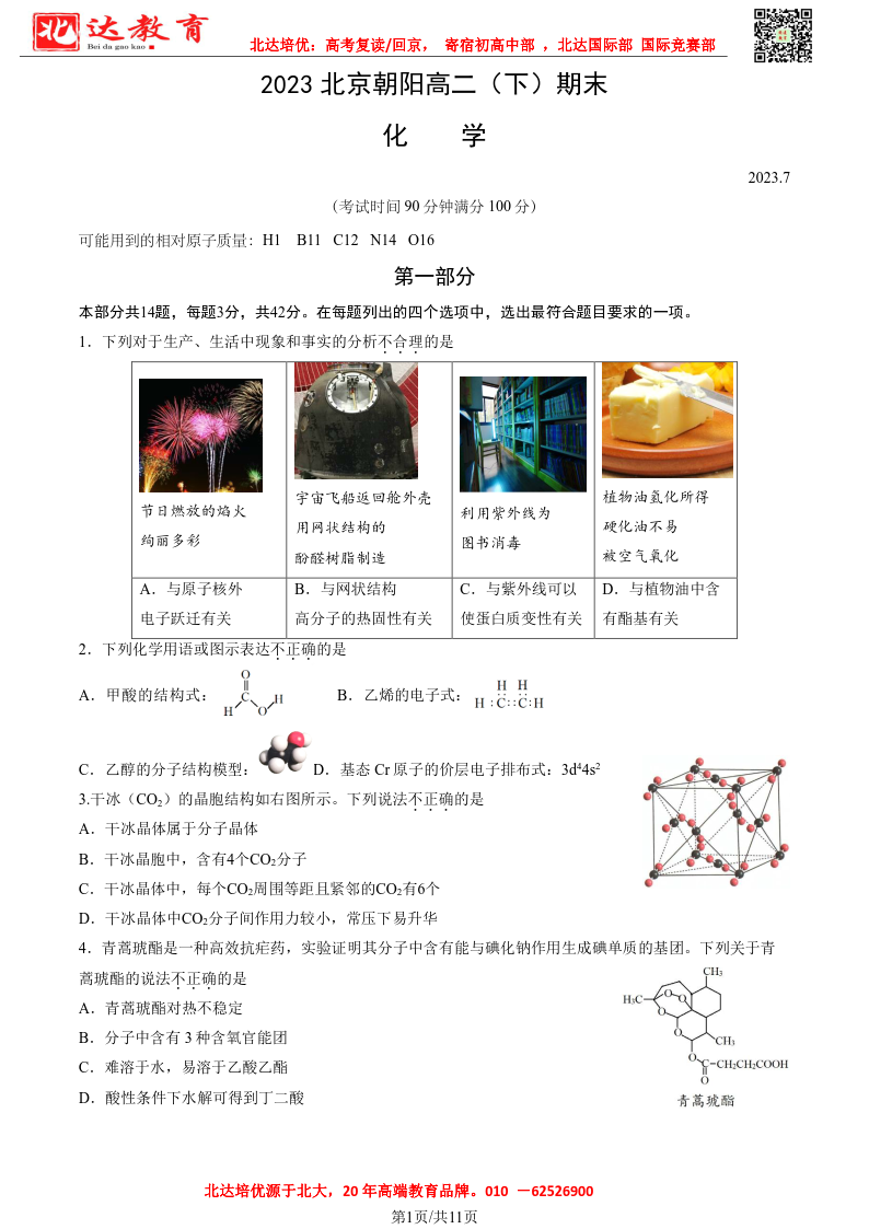 北京市2022-2023年高二下学期期末考试即将开考,为了帮助考生更好的核对考试答案,admw360复读学校整理了2022-2023学年北京朝阳区高二下学期期末化学试题及答案,供考生参考。