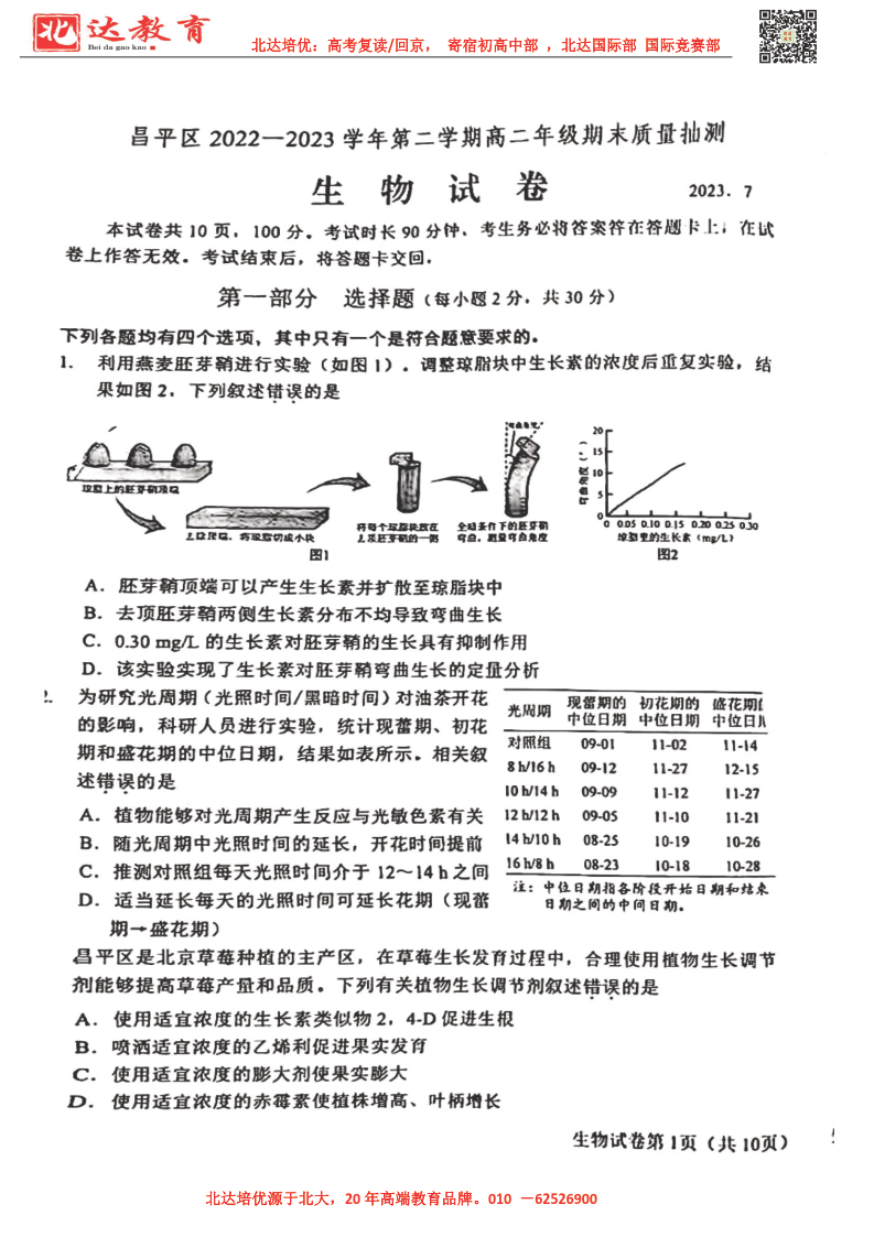 北京市2022-2023年高二下学期期末考试即将开考,为了帮助考生更好的核对考试答案,admw360复读学校整理了2022-2023学年北京昌平区高二下学期期末生物试题及答案,供考生参考。
