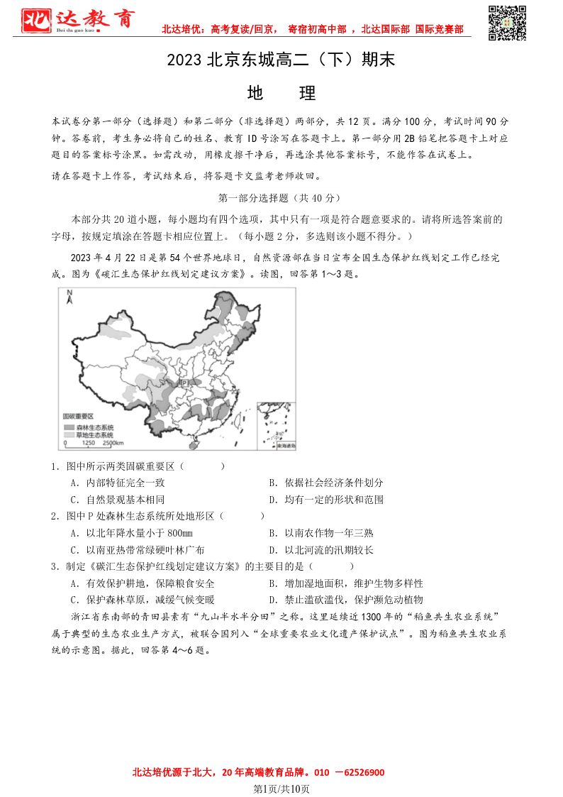 北京市2022-2023年高二下学期期末考试即将开考,为了帮助考生更好的核对考试答案,admw360复读学校整理了2022-2023学年北京东城区高二下学期期末地理试题及答案,供考生参考。