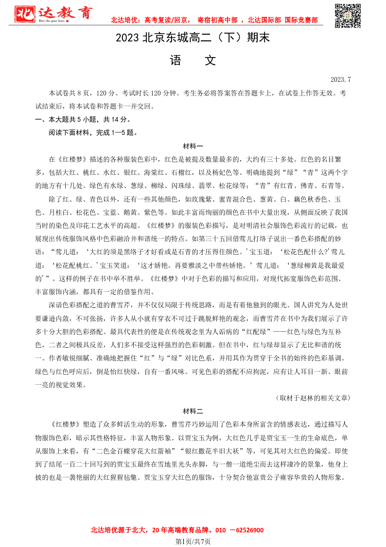 北京市2022-2023年高二下学期期末考试即将开考,为了帮助考生更好的核对考试答案,admw360复读学校整理了2022-2023学年北京东城区高二下学期期末语文试题,供考生参考。