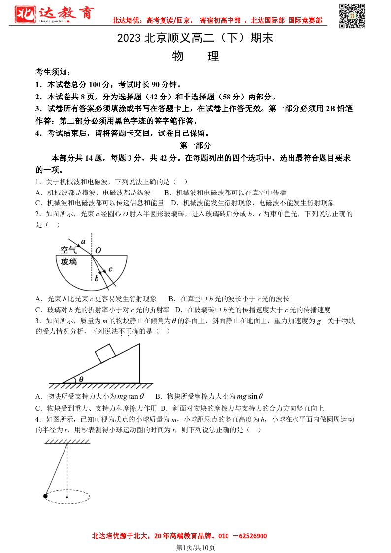 2022-2023学年北京顺义区高二下学期期末物理试题及答案