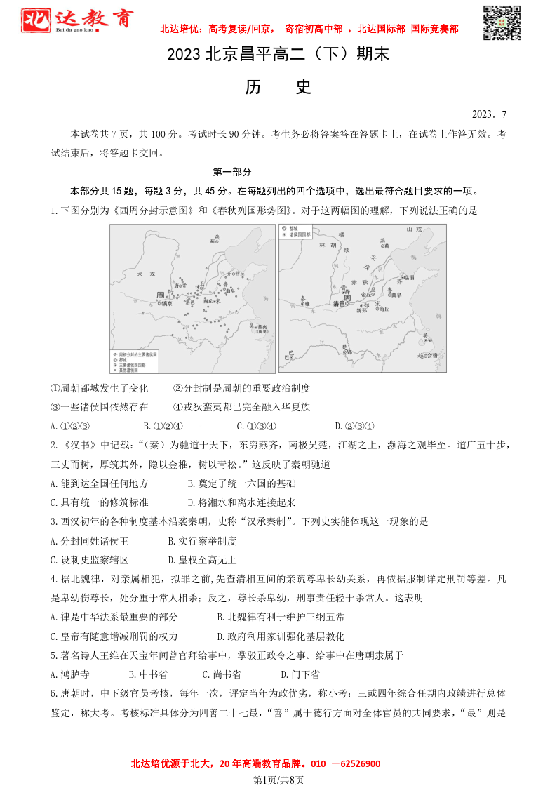 2022-2023学年北京昌平区高二下学期期末历史试题及答案