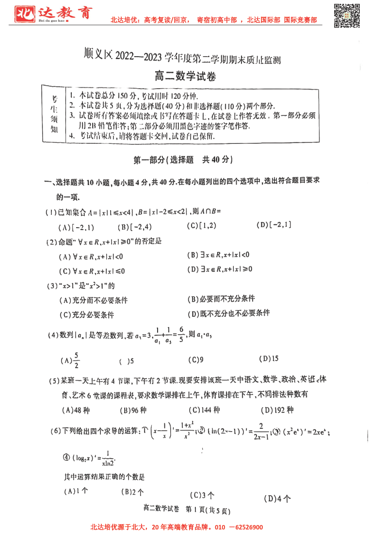 北京市2022-2023年高二下学期期末考试即将开考,为了帮助考生更好的核对考试答案,admw360复读学校整理了2022-2023学年北京顺义高二下学期期末数学试题及答案,供考生参考。