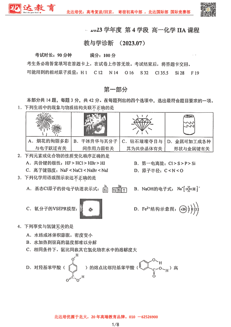 北京市2022-2023年高一下学期期末考试即将开考,为了帮助考生更好的核对考试答案,admw360复读学校整理了2022-2023学年北京十一学校高一下学期期末化学试题及答案,供考生参考。