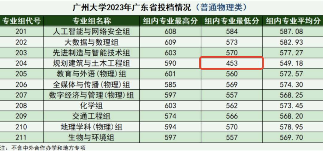 据广州大学公布的“广州大学2023年广东省投档情况”显示,该校今年普通物理类投档分数最低的为“规划建筑与土木工程组”即网友热议的453分,该组最高分为590分,平均分达到549.18分。
