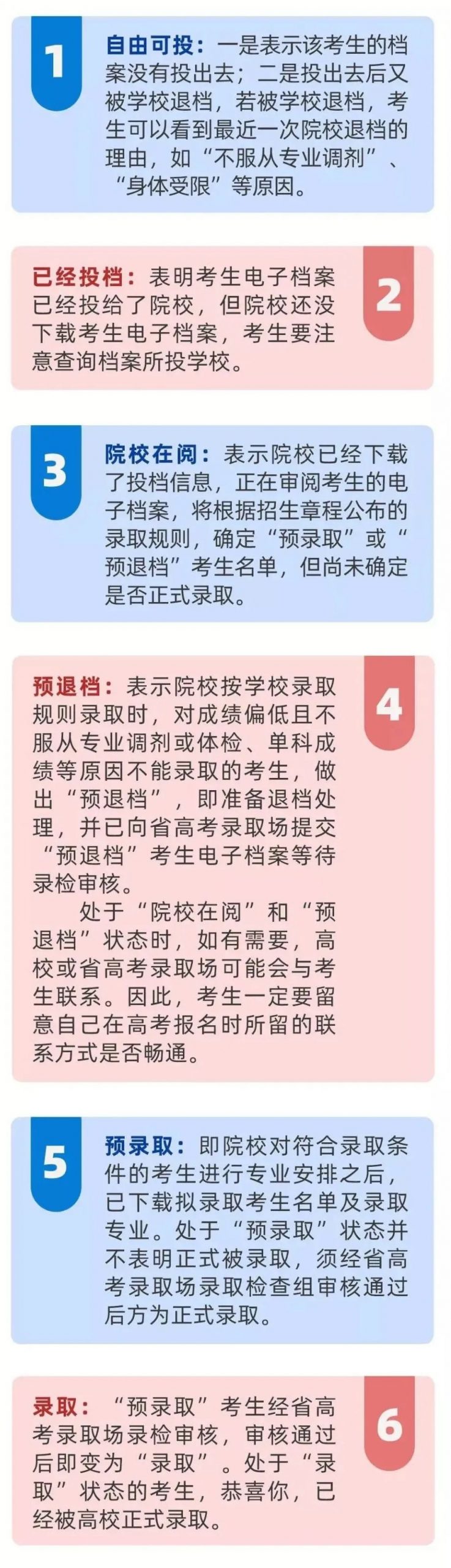 其实,全国也只有少数省份(如河南、广西、湖南)允许考生查询到档案状态,如“自由可投”、“已经投档”、“院校在阅”、“预退档”、“预录取”、“录取”等。