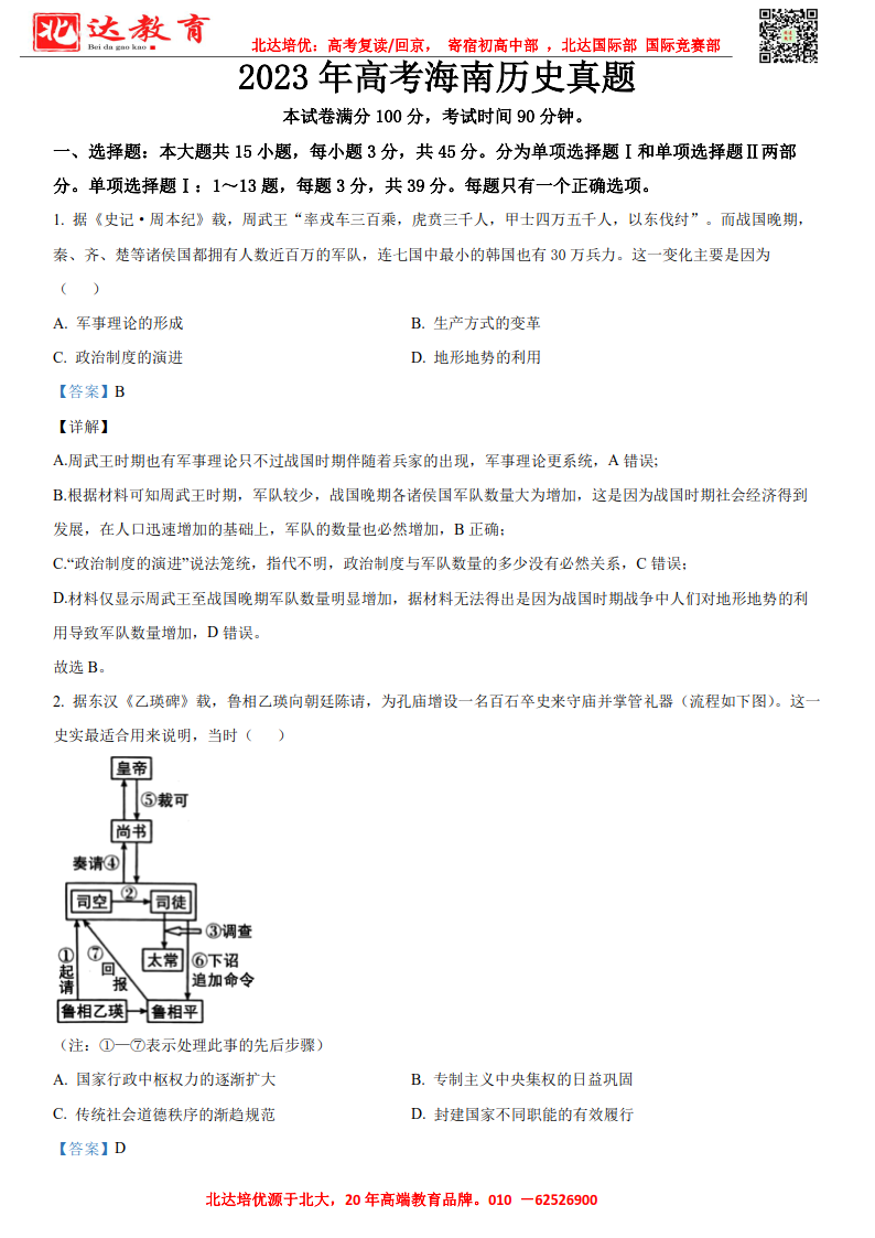 2023全国高考考试已结束,为了方便同学们查找高考试题答案进行估分,admw360复读学校整理了2023年海南高考历史试题及答案,分享给同学们。详情如下: