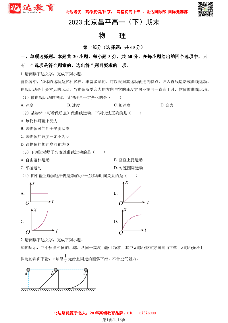 北京市2022-2023年高一下学期期末考试即将开考,为了帮助考生更好的核对考试答案,admw360复读学校整理了2022-2023学年北京昌平区高一下学期期末物理试题及答案,供考生参考。