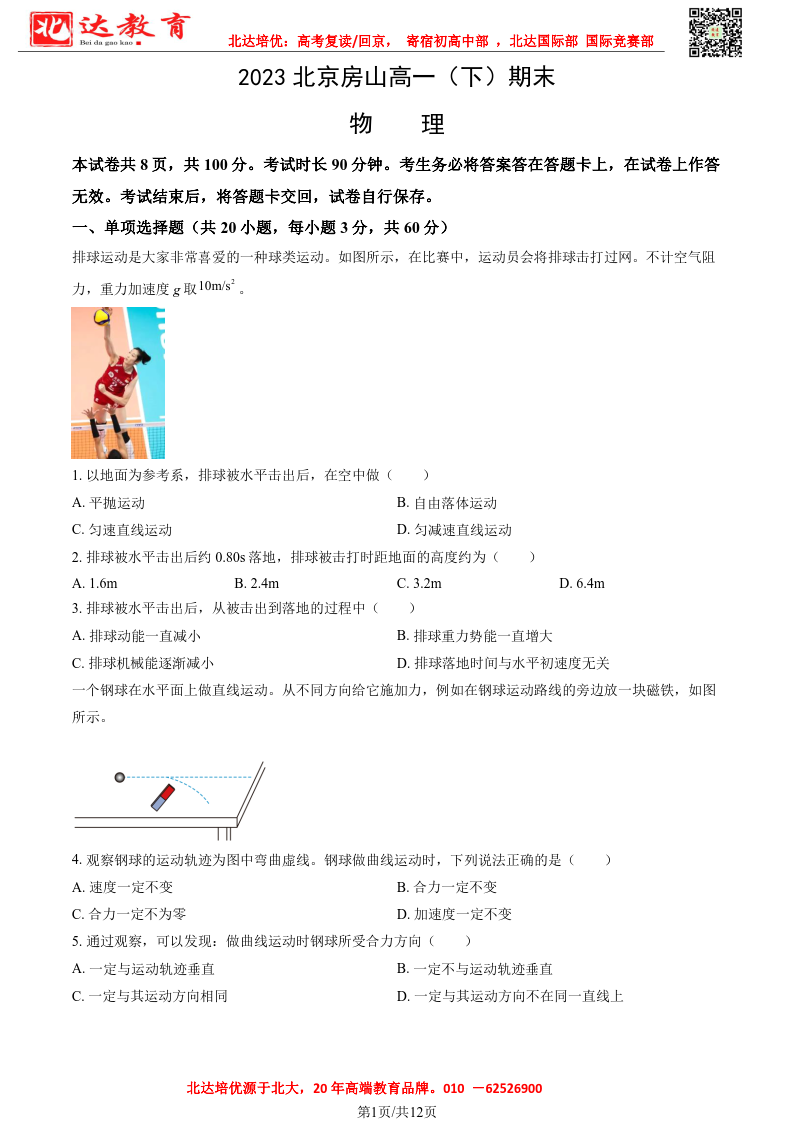 北京市2022-2023年高一下学期期末考试即将开考,为了帮助考生更好的核对考试答案,admw360复读学校整理了2022-2023学年北京房山区高一下学期期末物理试题及答案,供考生参考。