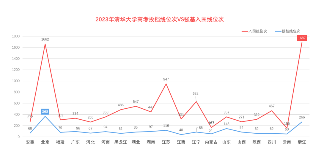 2022年清华大学在湖北的高考投档线位次为173名,强基入围线位次为445名,相差倍数为2.6倍;2023年的高考投档线位次为85名,强基入围线位次为547名,相差倍数为6.44倍;