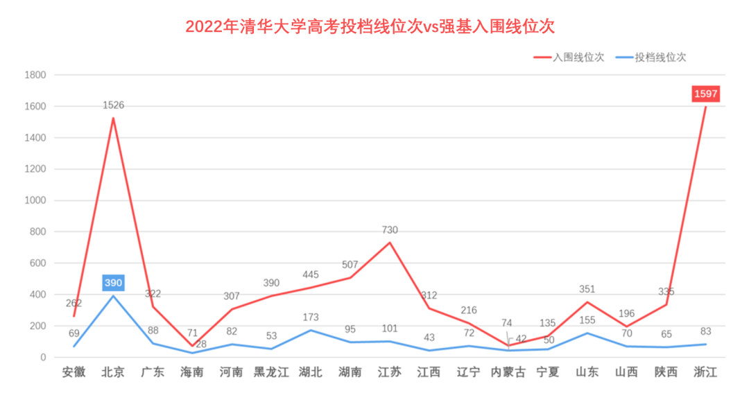 在清华大学,强基入围线位次最低的省份为北京和浙江,只需要分别达到1600名左右即可入围,和高考投档线位次相比,差距是非常大的。