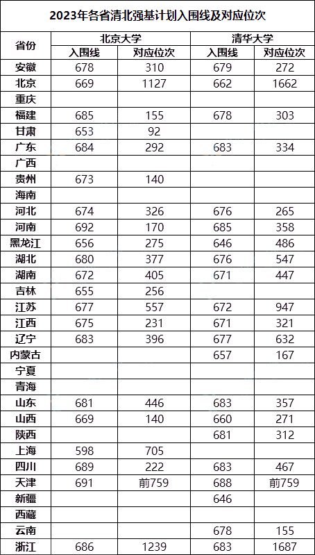 从强基入围分数线来看,2023年北大除安徽、河北、山东三省分数线略低于清华外,在其他省份的强基入围分数线均高于清华,其中分数差距最大的为黑龙江省,北大强基入围分数线高于清华10分,而位次差距最大的为浙江省,位次相差448位。