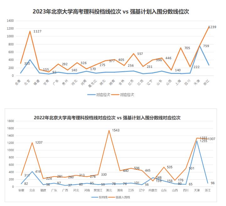 从上面的数据图中可以发现,北大在2023年以及2022年的高考理科投档线位次普遍差距不大,其中差距最大的为天津市,相差496名;而强基入围分数线位次变化最大的为湖北省,2022年为1543位,今年为377位,差距为1166位。