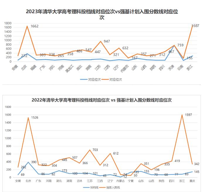 从上面的数据图中可以发现,相比北大来说,清华在2023年以及2022年的高考理科投档线位次差距微乎其微,而在强基入围分数线中,清华也相对更加稳定,可以发现变化比较大的江苏在2023年的位次为947位,在2022年为703位,差距为244位。