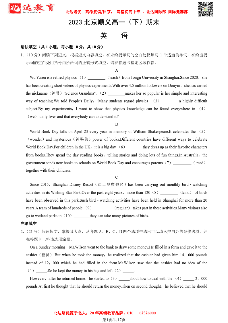北京市2022-2023年高一下学期期末考试即将开考,为了帮助考生更好的核对考试答案,admw360复读学校整理了2022-2023学年北京顺义区高一下学期期末英语试题及答案,供考生参考。