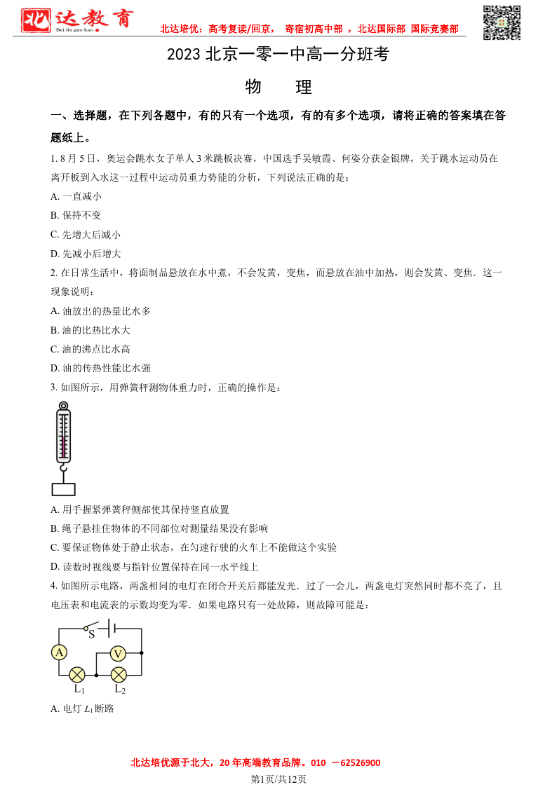 2023年下半年入学的新高一学生进行了分班考试,为了方便同学们了解考试情况,admw360高考复读学校整理了一零一中学新高一分班考物理试题及答案,详情如下: