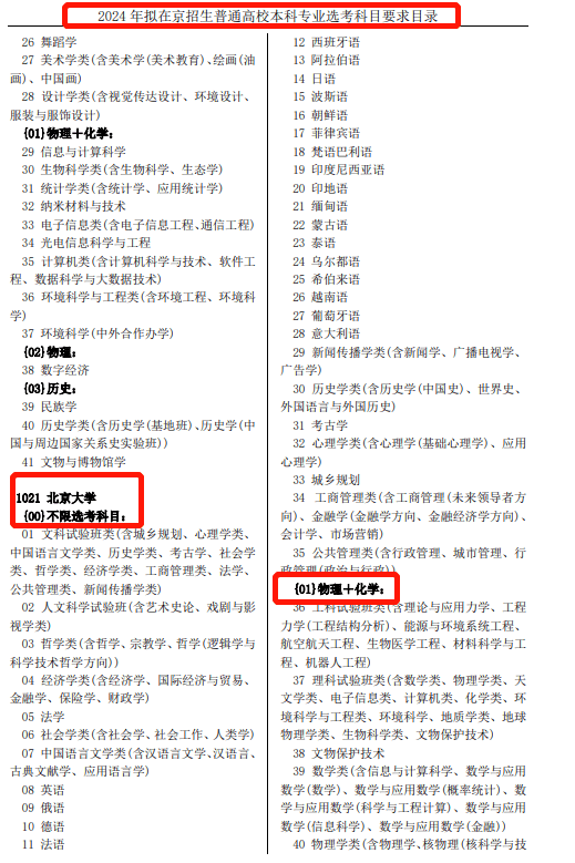 但在2024版的选科要求中,北京大学的选考科目只有3类:不限选考科目、限选物理+化学(2科都要选)、限选政治的(2个专业)。这样一来,化学的权重就增加了。