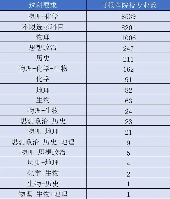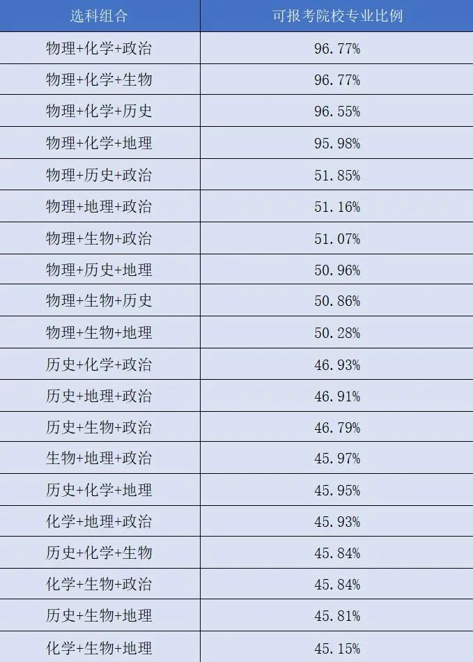 可以看出,只要选科中含有物理和化学两个科目,可报考的院校专业比例均超过95%。其中,物化生、物化政这个两个选科组合可报考的院校专业最多,占比均高达96.77%。若选科中仅有物理没有化学,仅可以报考50%左右的院校专业。若选科中不含物理,那么可选的院校专业比例降至45%~47%左右。