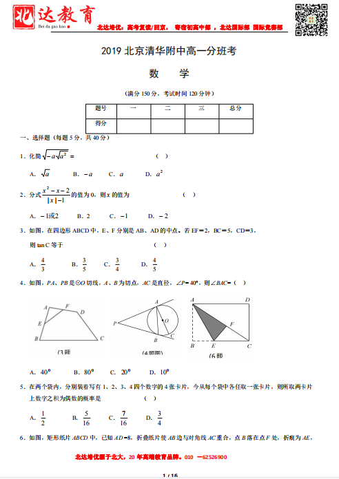 首页 名校题库 2019北京清华附中高一分班考数学(教师版)