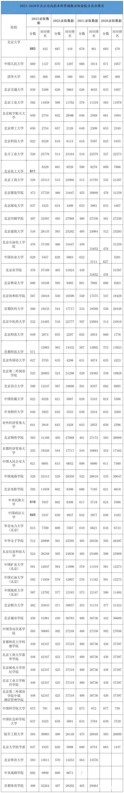 以下为2020-2023年北京市高招本科普通批录取最低分及市排名数据: