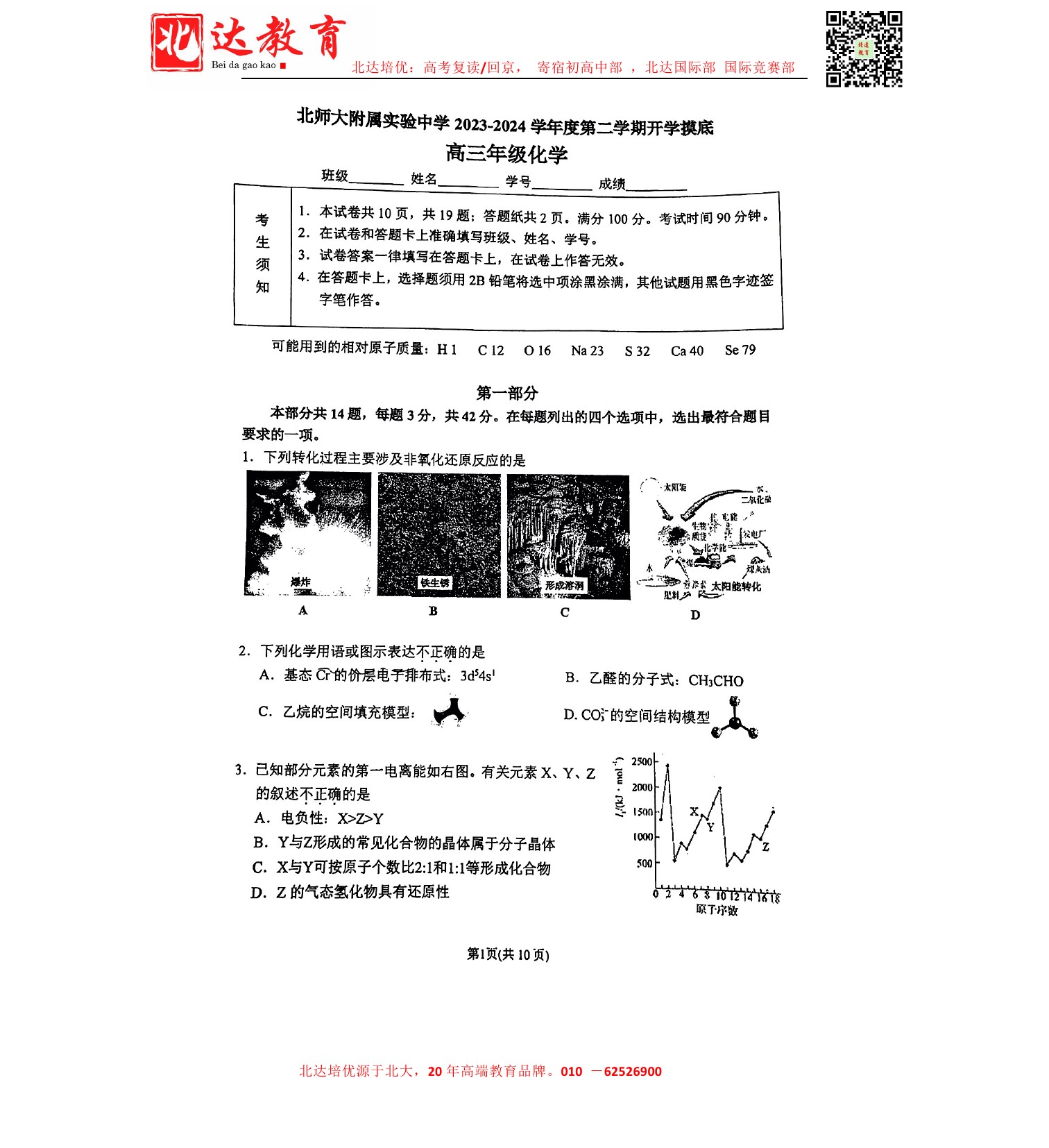 2024北京各中学高三开学考已结束,为了方便同学们查找相关试题,admw360高考网特意整理了2024北师大实验中学高三下开学考化学试题及答案,需要的同学赶紧下载练习吧。